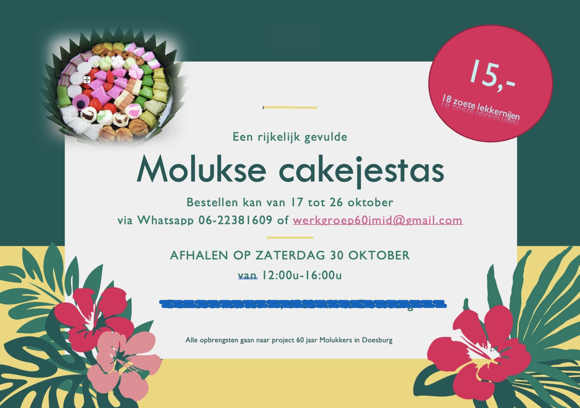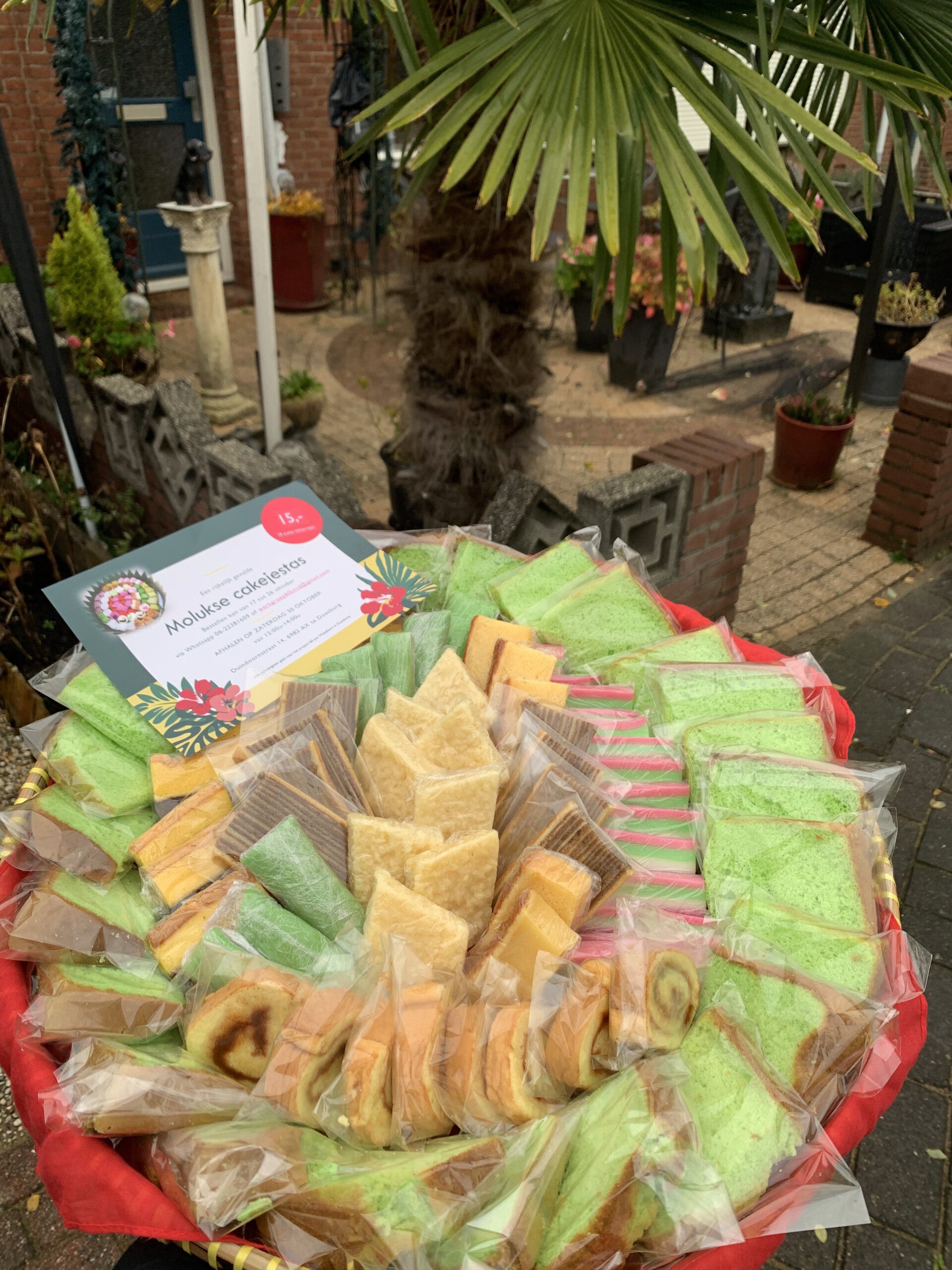 Op 29 oktober 2021 organiseerden wij onze eerste grote actie. Een Molukse cakejestas-actie. Zoals de naam al zegt; we verkochten tasjes met zelfgemaakte Molukse cakejes. Ramiro ging flyers ophangen in supermarkten, berichtjes plaatsen op sociale media. We hoopten dat we 30-40 tasjes zouden verkopen. Maar na een paar dagen raakten we wat onrustig: er waren al 100 tasjes besteld! Dat betekende dat we tenminste 1600 cakejes moesten bakken, 8 verschillende soorten.