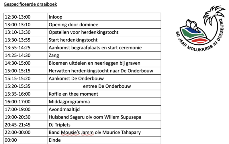 De dag is volgens Moluks gebruik met gebed geopend in de Molukse Beth-El kerk, waarna we startten met de herdenkingstocht. Tijdens deze processie liepen we gezamenlijk, onder begeleiding van tifa, met foto’s van (overleden) dierbaren die ons in de afgelopen zestig jaar ontvallen zijn, naar de Algemene Begraafplaats aan de Meipoortwal. Hier vond een korte ceremonie plaats. Na de ceremonie kreeg men de gelegenheid om een bloem bij het graf van overleden dierbaren te leggen. Na deze bloemlegging werd de herdenkingstocht hervat bij De Onderbouw. Voordat de feestavond plaatsvond was er voor iedere aanwezige een traditioneel Molukse avondmaaltijd, zodat iedereen met een voldaan gevoel de dansvloer op kon om de heupjes te bewegen met optredens van de Huisband Sageru (olv oom Willem Supusepa), DJ Triplets en Mousie’s Jamm (olv oom Maurice Tahapary).